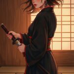 Set a dramatic mood with this Anime demon girl dojo wallpaper showing a horned warrior holding her katana inside a traditional Japanese room. The warm sunlight filtering through the shoji screen windows creates a cinematic atmosphere that highlights her detailed black and red kimono. This piece perfectly captures the “quiet before the storm” vibe for any desktop or mobile background.