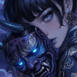 Enhance your screen with this stunning Blue Oni Mask Anime Girl wallpaper featuring a mysterious character with striking blue eyes and matching horns. The artwork blends traditional Japanese folklore with modern aesthetic styles, showcasing intricate details on the Hannya mask and glowing accents. The cool blue color palette creates a calm yet powerful atmosphere for any digital device.
