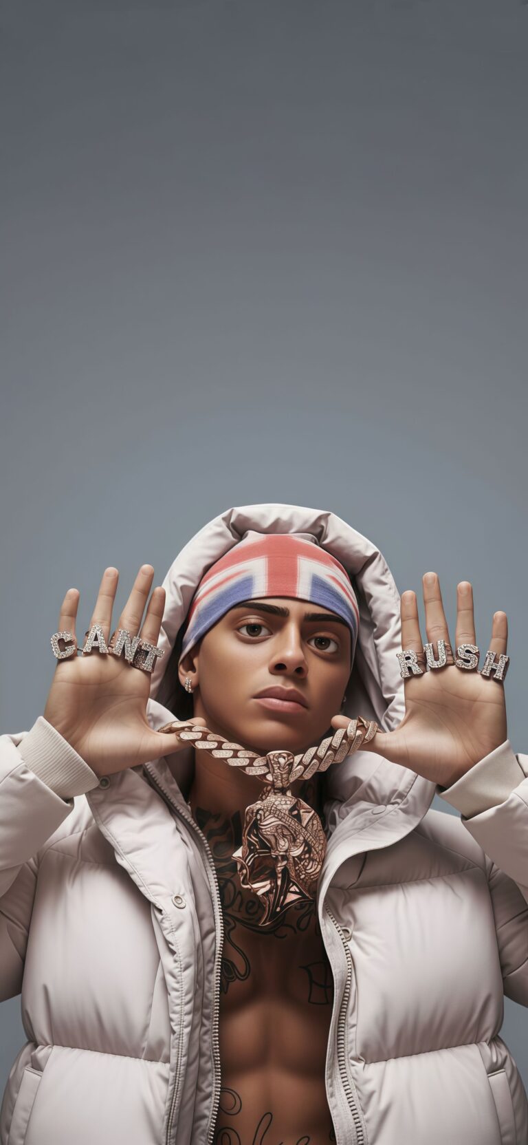 Central Cee ‘Can’t Rush’ Cartoon Wallpaper is a stunning 3D rendered digital art piece capturing the essence of the renowned British rapper, Central Cee. This high-quality wallpaper features a detailed, stylized cartoon likeness of the artist wearing a white puffer jacket and a Union Jack flag bandana. His hands are raised to display the signature diamond-encrusted ‘CAN’T RUSH’ rings, complementing his prominent gold chain. The cool gray background makes the subject pop, creating a powerful and fashionable look. This aesthetic digital wallpaper is a must-have for enthusiasts of the UK Drill scene and modern cartoon aesthetics.