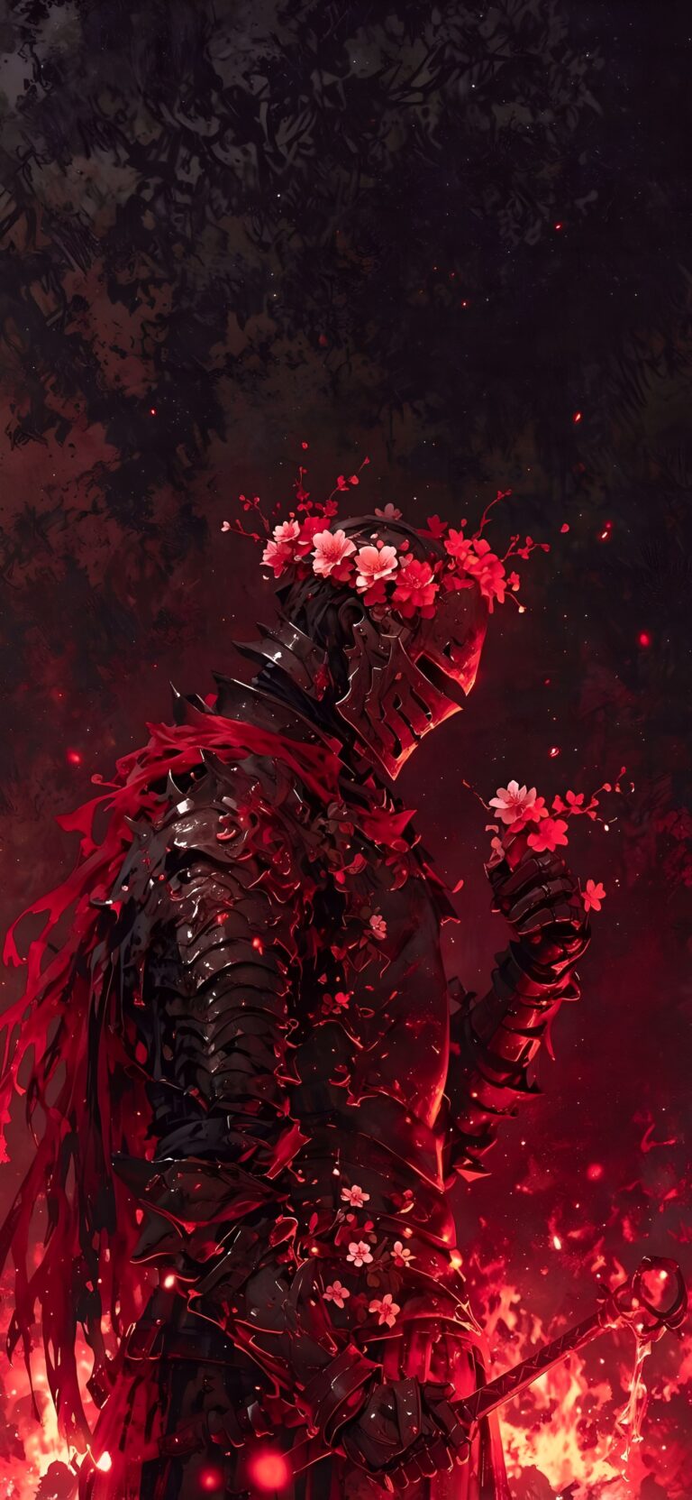 Embrace the dark elegance of this Crimson Cherry Blossom Knight Wallpaper, where a dark-armored warrior is adorned with delicate red flowers. Set against a backdrop of fire and shadow, this high-quality 4K mobile background is both fierce and artistic. The “Blood Knight” aesthetic paired with traditional floral motifs makes this a unique HD wallpaper for anyone who loves dark fantasy and Japanese-inspired gothic art.