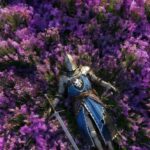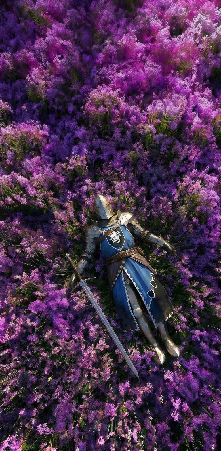 This Fallen Blue Knight in Lavender Wallpaper provides a unique top-down perspective of a knight in blue surcoat resting eternally in a sea of purple flowers. The vibrant violet hues and the detailed lion crest on the tunic create a high-quality phone wallpaper that feels like a scene from a tragic legend. This 4K wallpaper is ideal for users seeking a beautiful yet melancholic aesthetic for their mobile device. 💜🗡️