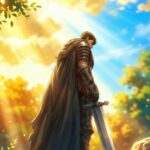 Stand tall with the legendary warrior in this Guts Berserk Heroic Standing Wallpaper. This full-body shot features Guts in his heavy armor, cape flowing in the wind as he looks out over a bright, hopeful horizon. The lens flare and warm lighting transform this wallpaper into an inspiring piece of art, showcasing the protagonist’s indomitable will to survive against all odds. It brings a sense of epic scale to your mobile or desktop screen.