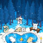 Stay cozy with the Heart Pond Winter wallpaper, featuring a group of adorable bears enjoying a steaming hot spring in a snowy forest. This 4K high-quality image showcases a unique heart-shaped blue pond surrounded by tall evergreens under a starry night sky. The contrast between the cold blue snow and the warm campfire makes this phone background a top-tier choice for winter lovers. It’s a perfect blend of “cozy core” aesthetics and beautiful character design for your device.