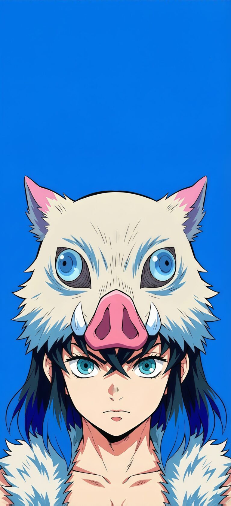 Make a bold statement with this Inosuke Hashibira Boar Mask Portrait Wallpaper, featuring the wildest member of the Demon Slayer trio. This minimalist anime wallpaper uses a vibrant blue background to contrast Inosuke’s iconic boar head mask and his piercing blue eyes. Designed specifically as a 4K mobile background, the clean lines and pop-art style make it look incredible on OLED and high-resolution screens. If you are a fan of Beast Breathing and Inosuke’s hilarious yet fierce personality, this stylized character wallpaper is the perfect way to show your love for the series.