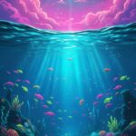 The Neon Fantasy Ocean Pink Cloud Dream Wallpaper is a vibrant, highly stylized piece of digital art. The scene is dominated by a breathtaking sky above the ocean, filled with dramatic, neon pink and purple clouds that catch the light of a setting or rising sun. Below the water, the scene is equally spectacular: a surreal and glowing coral reef thrives, populated by schools of small, brightly colored fish in pinks, yellows, and greens. The light filtering down is a vibrant turquoise, illuminating the sandy path and the fantastic formations of the reef. This aesthetic wallpaper is perfect for adding a burst of colorful, dreamy energy to your screen.
