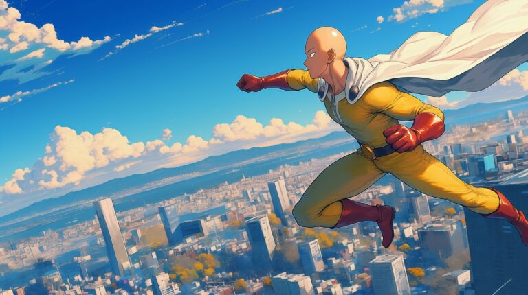 This One Punch Man Saitama desktop wallpaper offers a breathtaking view of the Caped Baldy hovering above a sprawling, detailed metropolis. The artwork uses a vibrant, saturated color palette to highlight Saitama’s iconic costume against the intricate architecture of the city below. Available in ultra-HD resolution, this high-quality anime wallpaper brings the scale and intensity of the One Punch Man universe directly to your phone or PC screen with stunning precision.