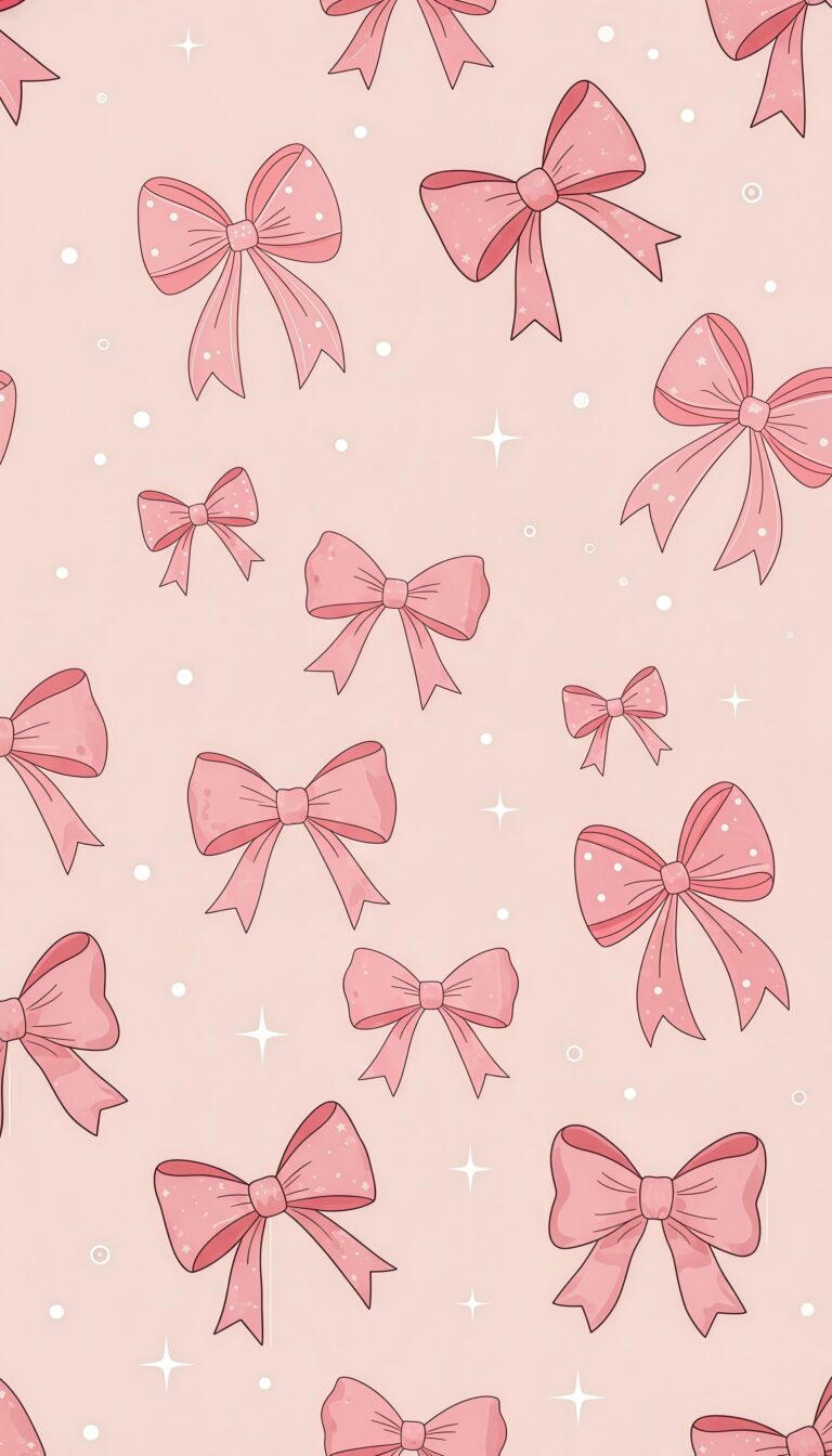 The Watercolor Pink Bow Aesthetic Wallpaper offers a sophisticated and ethereal take on the bow motif. The bows themselves appear as if painted with a gentle, flowing watercolor technique, giving them a softer edge than the other illustrations. The background is a wash of pale pink texture, highlighted by large, blurry circles of light—the beautiful bokeh effect—that lend a dreamy, out-of-focus quality. This wallpaper feels elegant, artistic, and perfectly soft, making it a stylish choice for a screen background.