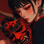 Immerse yourself in the intense aesthetic of this Red Oni demon girl wallpaper which features a captivating character holding a traditional red Hannya mask. The warm, fiery tones and red eyeshadow emphasize the supernatural theme, making it a bold choice for fans of dark fantasy and anime-style illustrations. The intricate jewelry and horn details add a layer of elegance to this powerful portrait.
