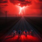 The Stranger Things Kids on Bikes Red Sky Lightning Road Wallpaper dramatically changes the peaceful scene into a terrifying one. The four boys are seen on the cracked road, facing forward, but now the entire scene is bathed in a deep red light from a stormy sky split by bright lightning bolts. This powerful wallpaper clearly depicts the invasion of the Upside Down, juxtaposing childhood innocence against supernatural danger.