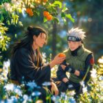 The Suguru Geto and Kakashi Hatake Crossover Wallpaper brings together two of the most iconic characters from Jujutsu Kaisen and Naruto in a beautiful sun-drenched meadow. This unique fan-art wallpaper depicts Geto in traditional attire sharing a quiet moment and a piece of fruit with Kakashi under a blooming orange tree. It is an artistic masterpiece that blends two different anime worlds into a single, harmonious scene filled with soft lighting and floral detail.