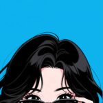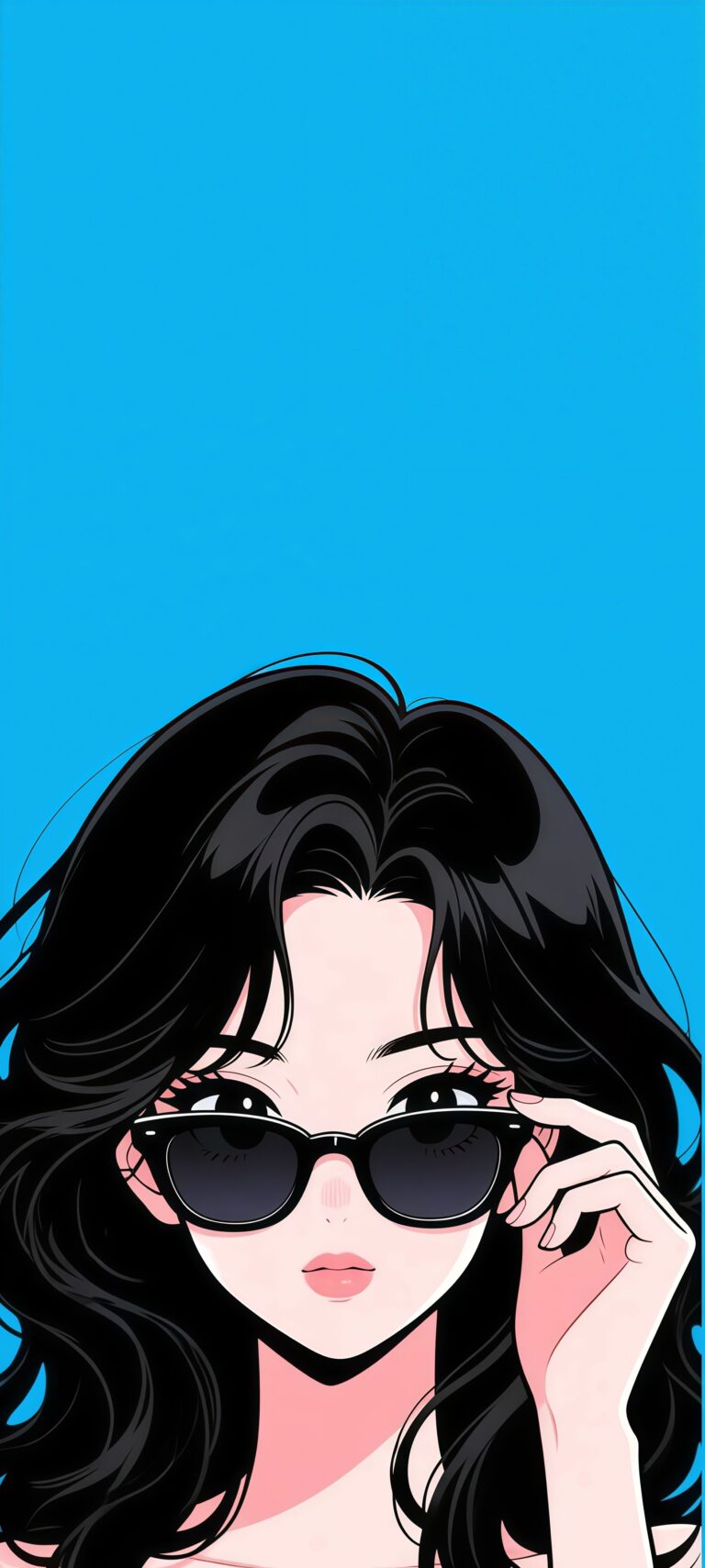 This wallpaper oozes summer chic and confidence! The character is stylishly pulling down her sunglasses for a playful, coy look. Her long, flowing black hair and bold expression are perfectly framed by the bright, solid blue background, making the image pop. It has a distinctly retro, ’80s or ’90s fashion illustration feel but with a modern anime line art. Use this for a fun, cool, and effortless aesthetic.
