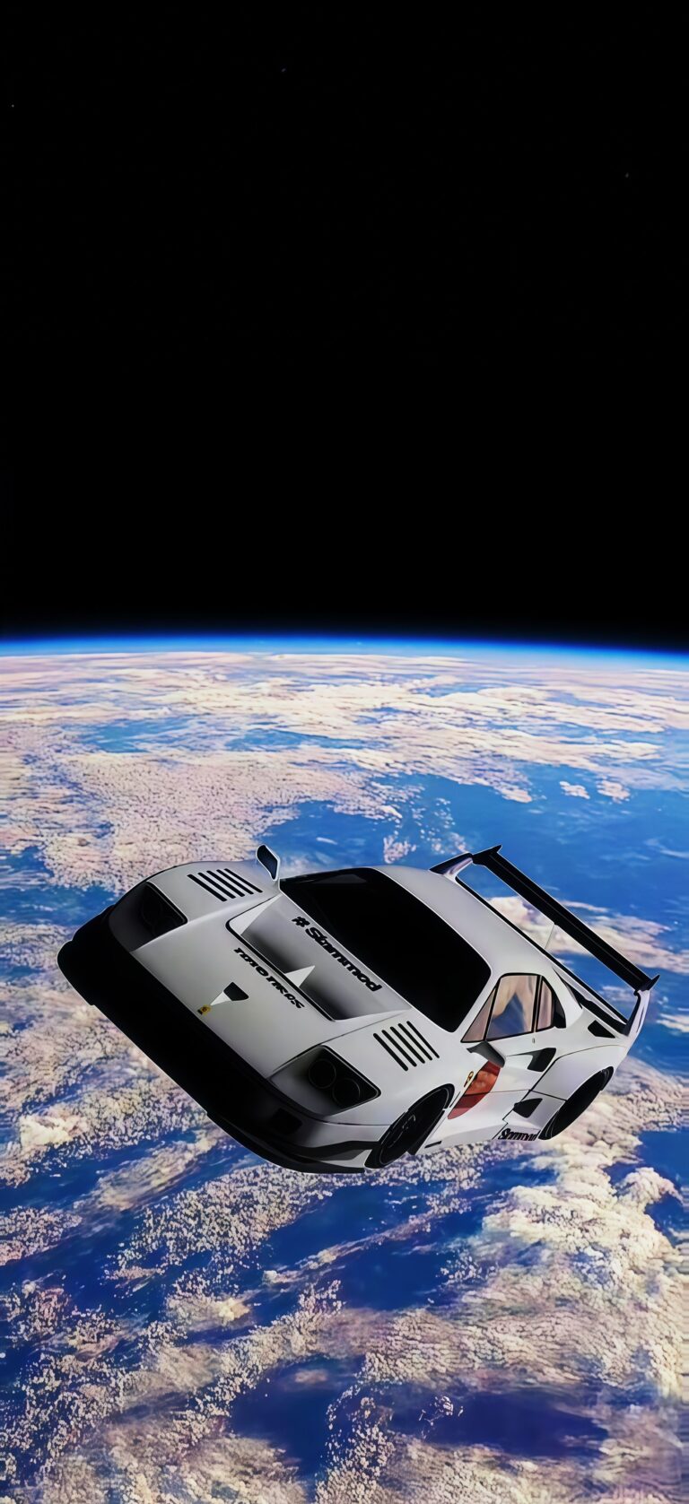 Experience the ultimate dream car with this White Ferrari F40 Galaxy Drift Wallpaper. This high-quality HD phone background presents the F40 from a high angle, appearing to soar over the blue oceans and white clouds of our planet. The clean white paint of the car creates a striking contrast against the dark void of space, making it a beautiful 4K wallpaper for any car lover’s device.