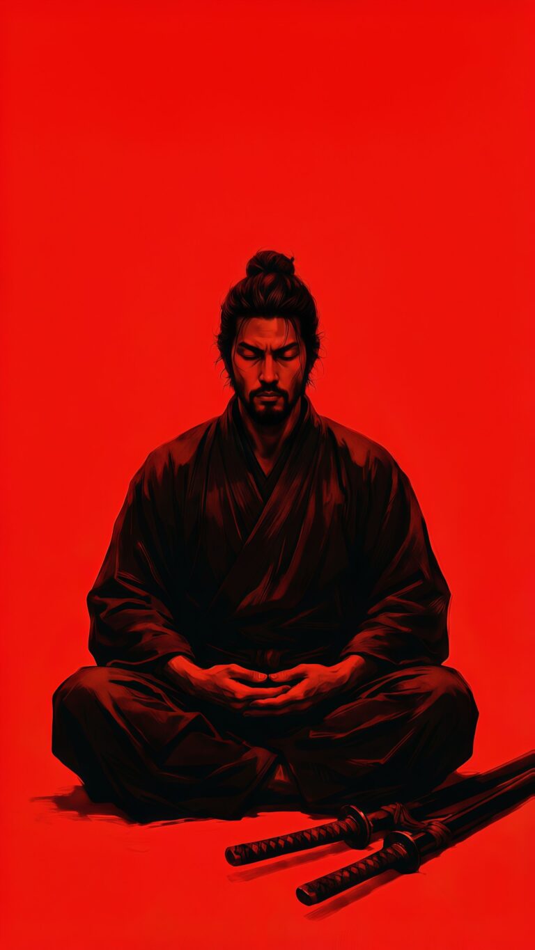 The Zen Vagabond Miyamoto Musashi Wallpaper illustrates the legendary swordsman in a moment of profound internal stillness. Seated in a meditative pose with his katanas resting peacefully before him, this wallpaper explores the philosophical depth of the warrior’s path. The high-contrast red aesthetic brings a modern, digital art flair to the traditional concept of Mushin (mind without mind). Enhance your screen with this representation of discipline and mental clarity.