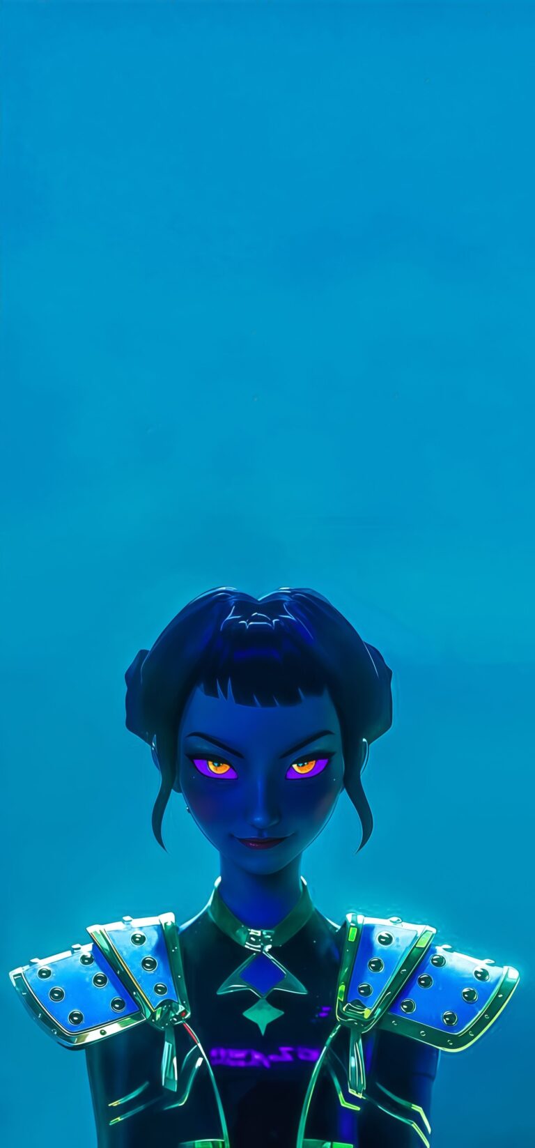 The Zoey Demon Hunter Wallpaper features the fierce and stylish Zoey from the K-pop inspired Demon Hunter universe. With her glowing orange eyes and futuristic emerald-trimmed combat gear, she embodies a high-tech cyberpunk aesthetic. This wallpaper uses deep blue tones and neon accents to create a striking visual impact, perfect for fans of urban fantasy and powerful female character designs.