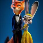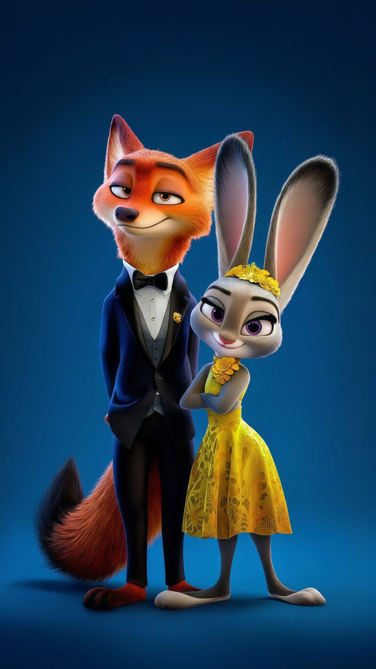 Dress up your device with this Zootopia Nick and Judy formal wallpaper featuring the pair in their finest evening attire. Nick looks dapper in a classic black tuxedo while Judy shines in a vibrant yellow floral dress with a matching headband. This high-quality render highlights the deep bond between the fox and rabbit in a sophisticated, elegant setting.