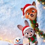 Celebrate the season with this Zootopia Nick and Judy snowman wallpaper featuring our favorite duo peeking out from behind a snowy tree. Complete with Santa hats, striped scarves, and a cute little snowman friend, this 3D art style captures the magic of a Zootopia winter wonderland. It is a cozy and adorable background choice for the holidays. ☃️🎁